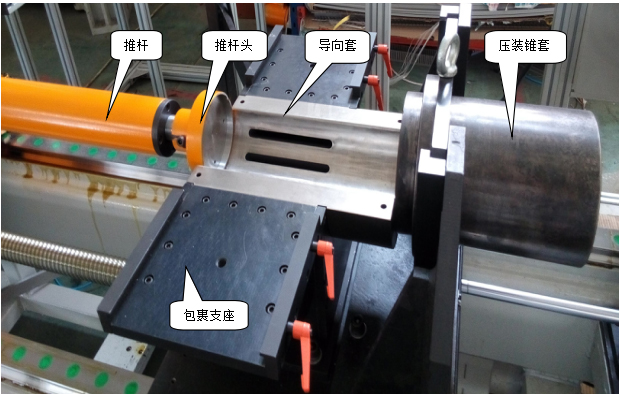 然后雙手將包裹好襯墊后的載體推入壓裝錐套后,點(diǎn)擊啟動(dòng)按鈕,夾緊氣缸動(dòng)作筒體夾緊對中,錐套氣缸動(dòng)作與客體貼緊,伺服電機動(dòng)作帶動(dòng)推桿前移,推桿頭通過(guò)壓裝錐套導向,將包裹襯墊的載體壓入殼體內部,壓裝到位后各裝置復位,完成一次壓裝工序。